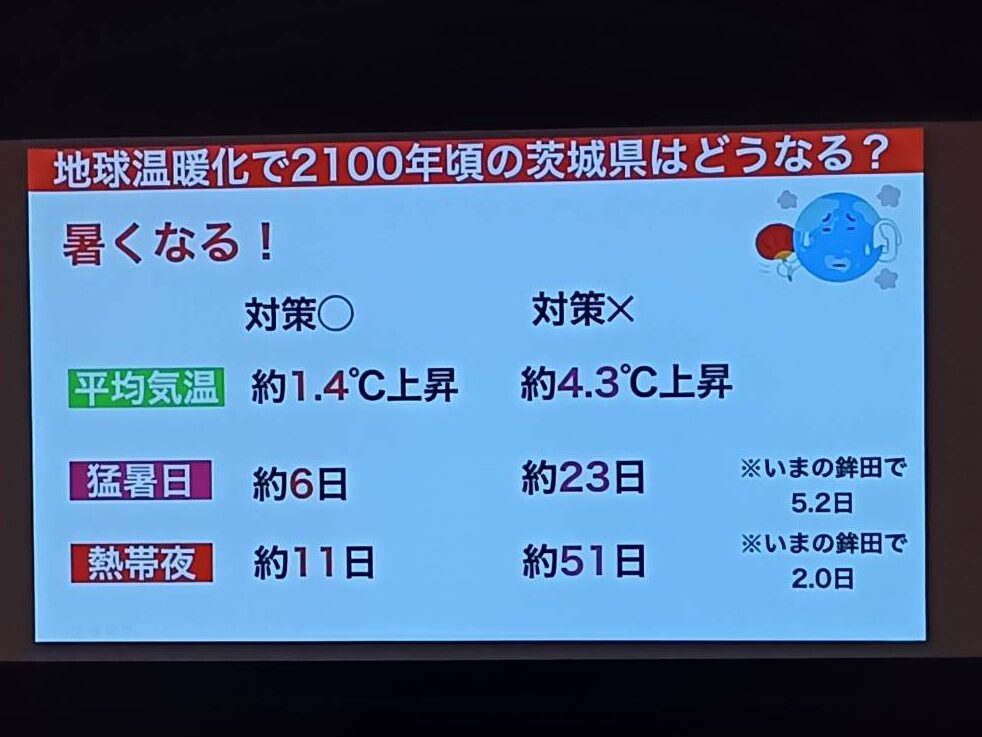 このまま対策しなければ2100年にはなんと平均気温が4.3度も上がり、夏場の日平均気温が30度近くになるとのことでした。(私はそのときも現役です笑)