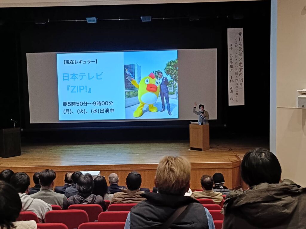 農業に直結する天気の読み方や異常気象とはどんなものかを、わかりやすくユーモアを交えながら説明していただきとても楽しい講演でした。